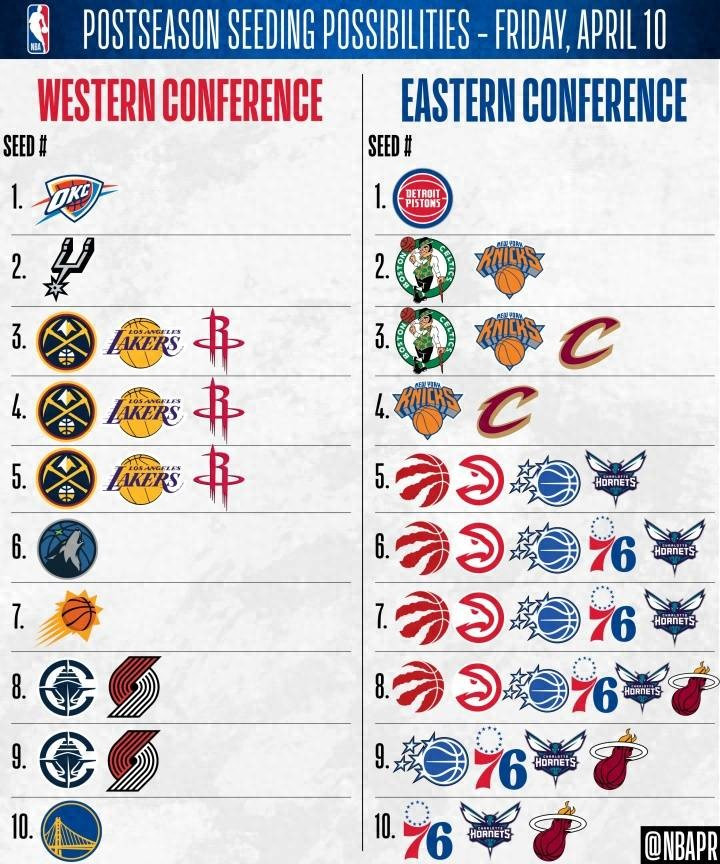 第八和第九的争夺在快船和开拓者之间展开。 两支球队战绩接近,谁能拿到第八就意味着附加赛有两条命,谁掉到第九就要背水一战。第十勇士搭上了附加赛的末班车,库里复出后的表现没能帮助球队更进一步,勇士只能从附加赛最底层打起。连赢两场客场才能拿到八号种子,这个任务对勇士来说难度极大。