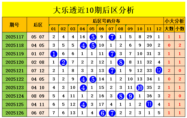 后区近10期大小比为10:10,大、小码奖号走势相同,上期开出小大组合,近3期开出,大大、小大、小大、组合,本期后区推荐小小组合;