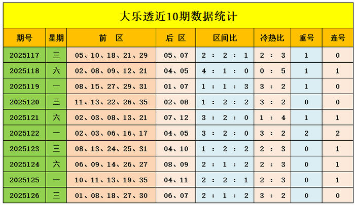 上期回顾:大乐透第2025126期奖号为:前区01、08、18、27、30,后区06、07,前区奖号三区比为2:1:2,冷热比为3:2,后区开出小大组合06、07