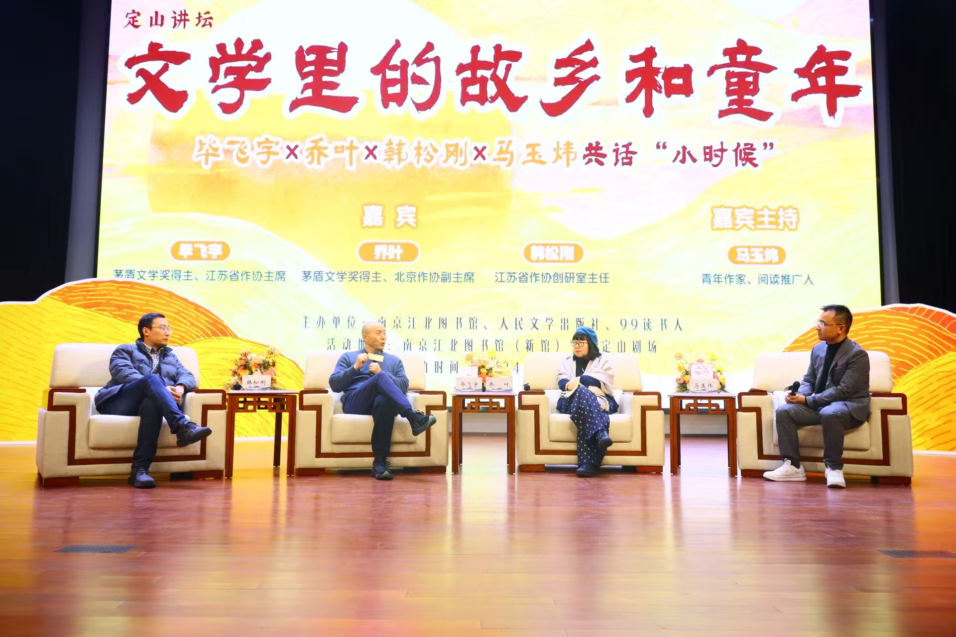 江南时报讯(记者 杨爽 通讯员 陈婷)1月24日下午,南京江北图书馆一层定山剧场内座无虚席,由南京江北图书馆和人民文学出版社、99读书人联合举办的“定山讲坛”第二十五期活动在此启幕。茅盾文学奖得主毕飞宇、乔叶,江苏省作协创研室主任韩松刚与青年作家马玉炜齐聚一堂,以“文学里的故乡和童年”为主题,用深度对话形式,围绕文学创作中的地域差异、文化根源、生命思考等核心话题展开交流,为现场200余名读者及超五万名线上观众带来了一场兼具思想深度与人文温度的文学盛宴。