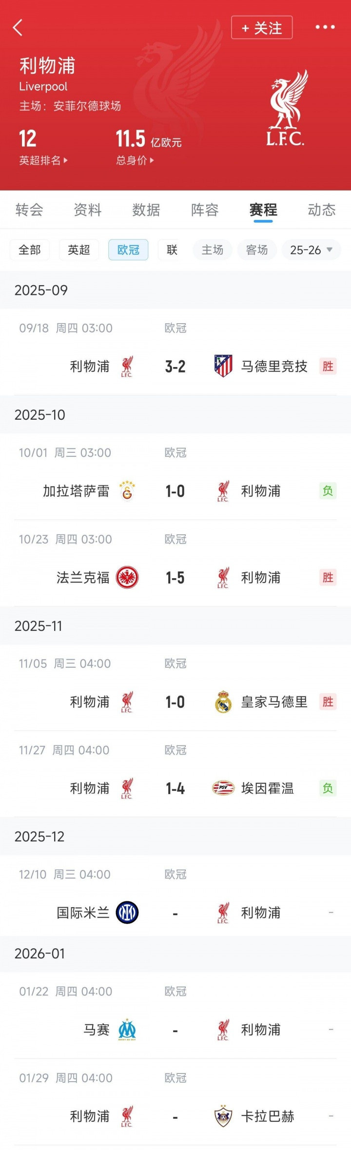 强弱不详…利物浦欧冠连克马竞皇马+大胜法鹰, 但不敌荷甲土超榜1